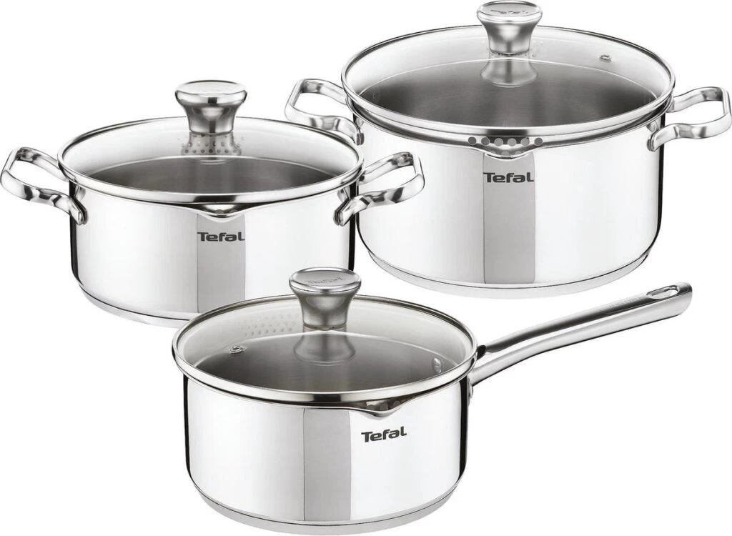 Deze 3-delige roestvrijstalenDuetto kookset van Tefalcombineert een eigentijds design met optimaal gebruiksgemak. Het roestvrij staal is van een duurzame Premium kwaliteit. Niet voor niets geeft Tefal 10 jaar garantie op het roestvrij staal van deze kookset. De duurzame dikke sandwichbodem (rvs-aluminium-rvs) is zeer vormvast en zorgt ervoor dat de warmte snel en gelijkmatig wordt verspreid.