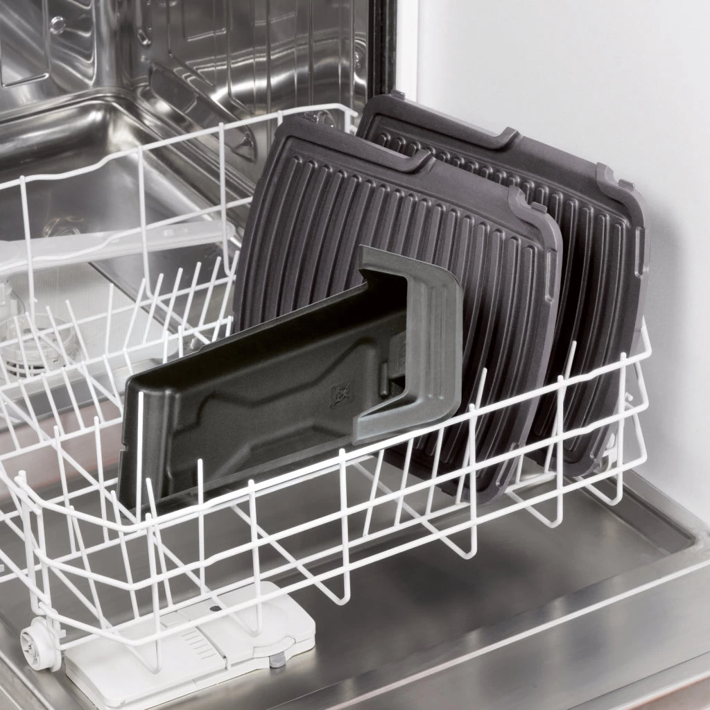 - Gemakkelijk te reinigen: de uitneembare anti-aanbakplaten en het opvangbankje zijn vaatwasmachinebestendig