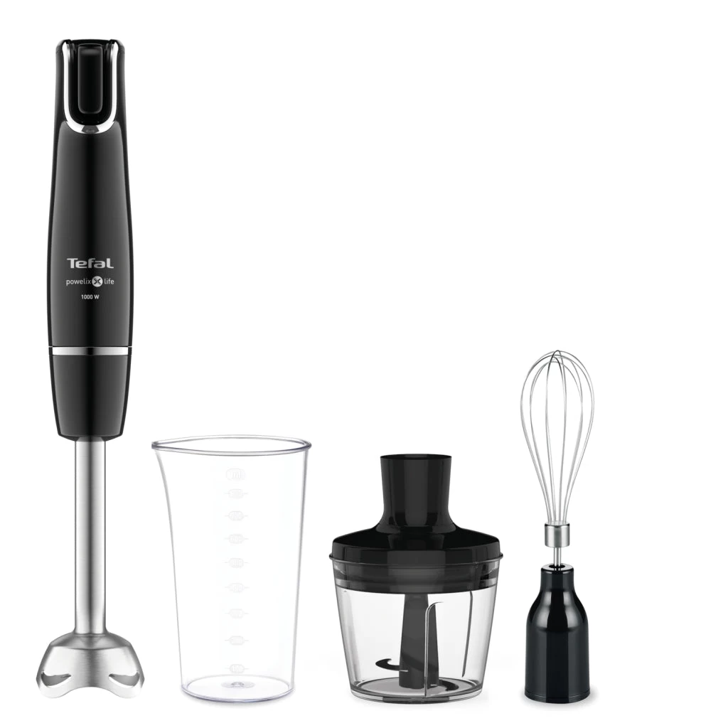 Geniet van uitzonderlijke prestaties en precisie met de Tefal HB9438 InfinyForce staafmixer. De Powelix Life-technologie mixt met hoogwaardige messen voorzien van een titanium coating, voor perfecte resultaten en duurzaamheid. Met de nauwkeurige multi-speed trigger knop heb je gemakkelijk controle op het mixen en kun je iedere gewenste textuur bereiken. De InfinyForce heeft een krachtig vermogen van 1000 W, die zorgt voor snelle resultaten bij zelfs de hardste ingrediënten. Eén veelzijdig apparaat, waarmee je alle ingrediënten perfect mixt. De Tefal InfinyForce staafmixer biedt precisie en gemak, met langdurige prestaties en razendsnelle resultaten. Vanaf nu maak je moeiteloos heerlijke nieuwe recepten. Ga eens voor zelfgemaakte soep, puree, salsa, pesto en nog veel meer. De exclusieve Powelix Life messen zijn uitzonderlijk duurzaam: prestaties die tot wel twee keer langer meegaan en 30% snellere mengresultaten garanderen. Precisie is letterlijk binnen handbereik met de gebruiksvriendelijke multi-speed trigger snelheidsregeling, waarmee je elke textuur of resultaat kunt mixen. Hoe harder je drukt, hoe sneller de staafmixer mixt. 1000W vermogen zorgt voor een optimale menging in een mum van tijd, zelfs bij de hardere ingrediënten. Ontdek het staafmixerpakket: een anti-spatvoet om je keuken spatvrij en schoon te houden, mengbeker 800 ml en veelzijdige hulpstukken, zoals een hakmolen 500 ml en een garde. De staafmixer is gemakkelijk te reinigen, de verwijderbare onderdelen zijn vaatwasmachinebestendig.