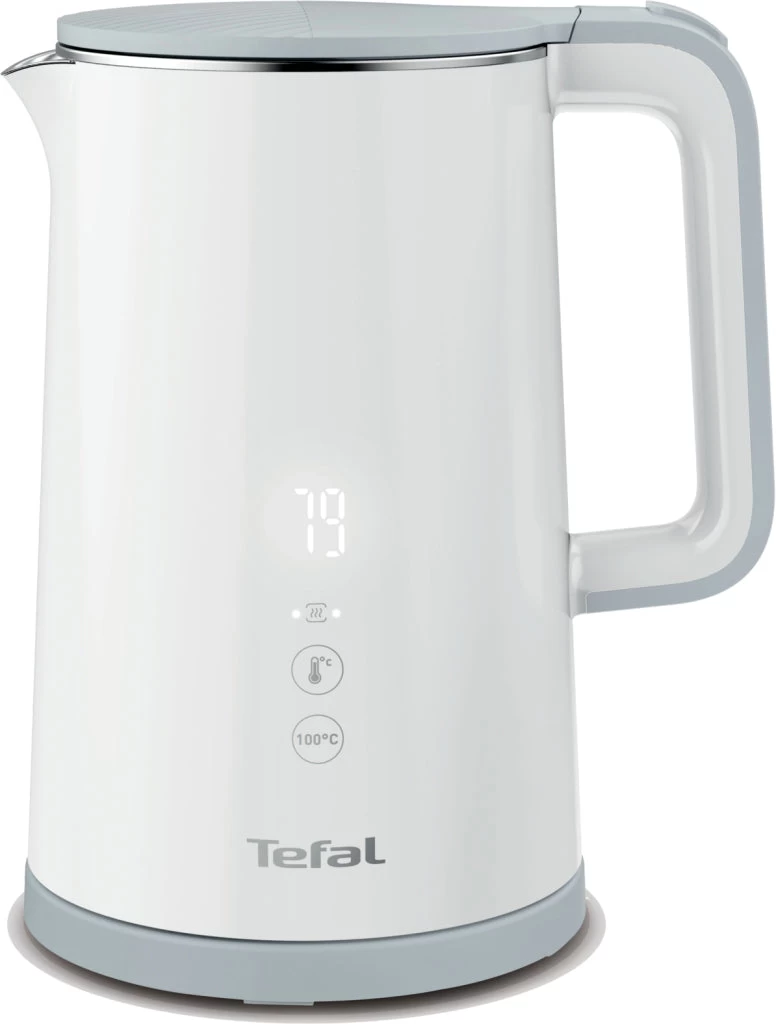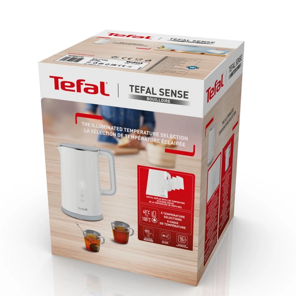 Tefal Sense waterkoker: de modernste temperatuurselectie Geniet met de Tefal Sense waterkoker van warme dranken op precies de juiste temperatuur, perfect afgestemd op ieder zijn of haar wensen. De moderne, intuïtieve waterkoker is voorzien van een vooruitstrevend naadloos, digitale display dat de daadwerkelijke temperatuur van het water weergeeft. De waterkoker heeft vijf temperatuurinstellingen van 40 ° C tot 100 ° C – perfect voor het verwarmen van water met één enkele aanraking. De dubbelwandige waterkoker houdt de warmte binnen, waardoor de buitenkant koel blijft, zodat de waterkoker veilig is om aan te raken. Geniet van handige functies, zoals een warmhoudfunctie van 30 minuten, automatische dekselopening voor het eenvoudig vullen, een 360 ° draaibare voet en een automatische uitschakeling voor zorgeloos gebruik. Met een royale inhoud van 1,5 liter is de waterkoker ideaal voor al jouw behoeften op het gebied van warme dranken.