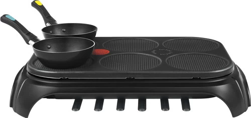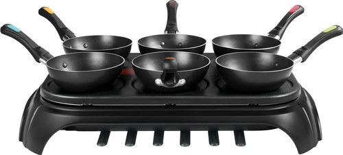 Met de Tefal WokParty Duo PY5828 wok en grill je gerechten. De plaat is namelijk zonder pannetjes te gebruiken als bakplaat. Zo maak je bijvoorbeeld een omelette of een pannenkoekje. De wokpannetjes zijn verschillend van kleur, zodat je gemakkelijk onthoudt welk pannetje van jou is. Handig, want zo eet je niet per ongeluk het eten van jouw buurman op. Dankzij de Thermo-Spot weet je precies wanneer jouw pannetje klaar is voor gebruik. De stip kleurt namelijk effen rood als ‘ie op temperatuur is. Na gebruik berg je het snoer en de spatels onder het gourmetstel op, zodat je ‘m gemakkelijk opbergt.